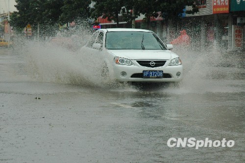 河南省淮阳县街头,一辆轿车通过一片积水溅起巨大水花。中新社发 杨正华 摄