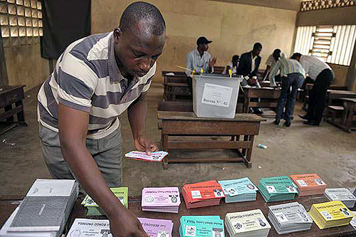 图为加蓬一名男子在利伯维尔投票站准备投票。