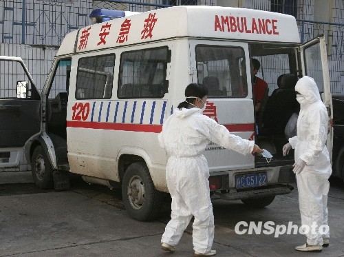 图为新安县医护人员正在接转甲型H1N1流感疑似病人。中新社发 张晓理 摄