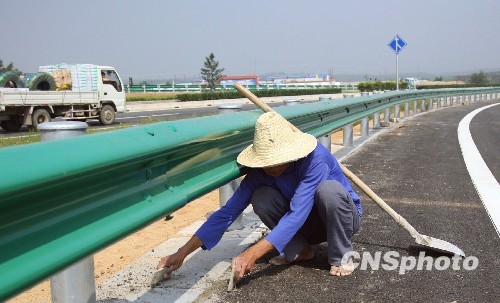 图为31日,烈日下坚守“岗位”的工人,为新公路做最后的“护理”。中新社发 翟羽佳 摄