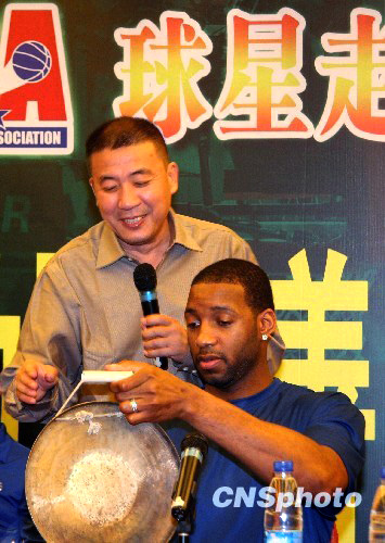 9月1日上午,美国NBA著名球星特雷西·麦克格雷迪在河北省石家庄市参加“温暖中国行动”慈善拍卖会,现场气氛高涨,麦迪也参与到竞拍当中,举手竞价。拍卖会上共拍卖有麦迪签名的三个比赛用球、一个海报和三件球衣,拍卖所得资金将全部用于救助石家庄市桥东区的贫困小学生。中新社发 李光 摄