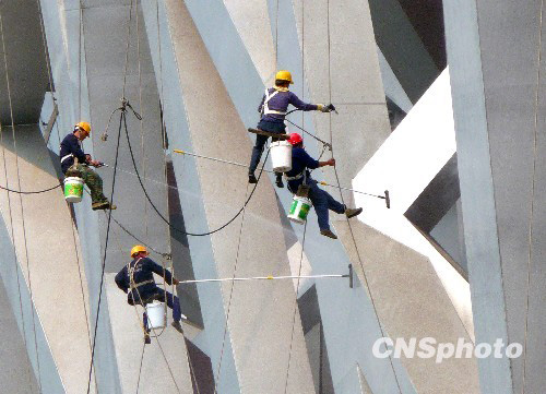 2009年9月1日,北京奥林匹克公园,几名“蜘蛛侠”正在清洗“鸟巢”钢梁上的尘土,使其以靓丽容貌迎接建国60周年。中新社发 玉龙 摄