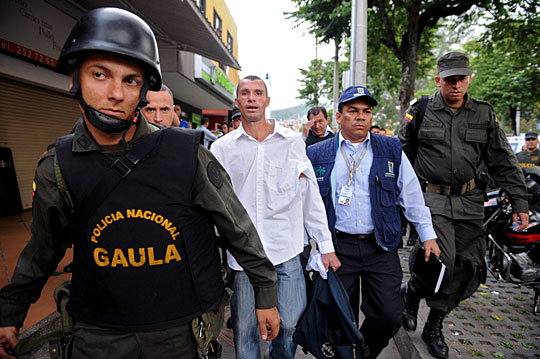 图为劫匪(白衣)被哥伦比亚警方带走。