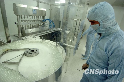 9月3日,技术人员正在生产线观察甲型H1N1流感疫苗的罐封状况。中新社发 施健学 摄