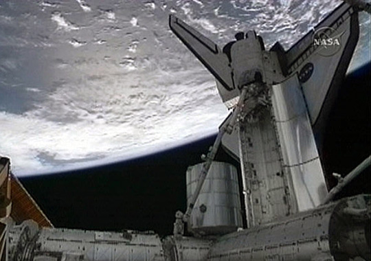 图为国际空间站和“发现”号航天飞机,照片中蓝白色背景为地球。