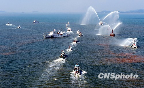 图为演习过程中,泄漏入海的50吨苯挥发形成大量易燃毒气,在总指挥部的统一组织协调下,各船艇正在稀释易燃毒气。中新社发 华志波 摄