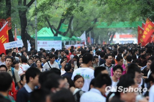 9月5日上午,北京大学南门内前来报到的新生将校园挤得水泄不通。当天是北京大学新生报到的首日。中新社发 侯宇 摄