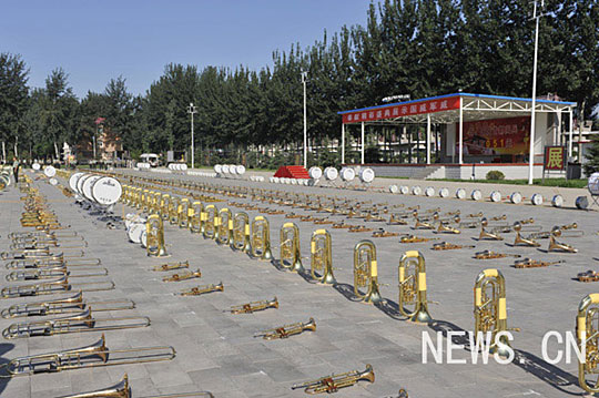 训练场上摆满了乐器。赵俊 摄