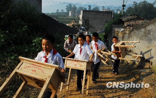 9月7日,四川省蓬安县一小学的孩子们收到某公司捐赠的100套爱心课桌和100个新书包,孩子们欢呼雀跃,村民们也赶来帮忙搬运课桌。中新社发 郭安平 摄