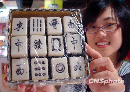 9月7日,在苏州一家商店,一名顾客正在展示“麻将”巧克力。近日,苏州市场上的巧克力翻出新花样,巧克力制成了“麻将牌”,引起了许多消费者的目光。中新社发 王建康 摄