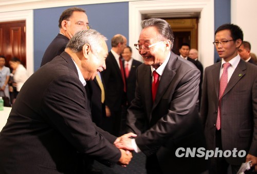 9月9日,正在美国访问的中国全国人大常委会委员长吴邦国,在国会大厦会见美国众议院三个涉华小组——美中议会交流小组、美中工作小组、中国小组的负责人。中新社发 周兆军 摄