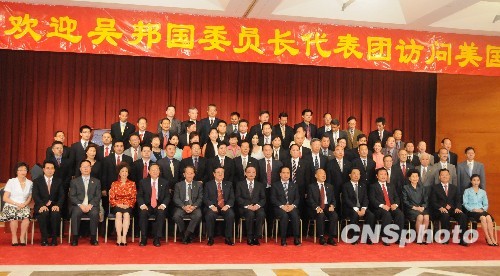 9月9日晚,正在美国访问的中国全国人大常委会委员长吴邦国在中国驻美大使馆会见了使馆工作人员、华人华侨、中资机构、留学生等代表,并与他们合影留念。中新社发 吴庆才 摄
