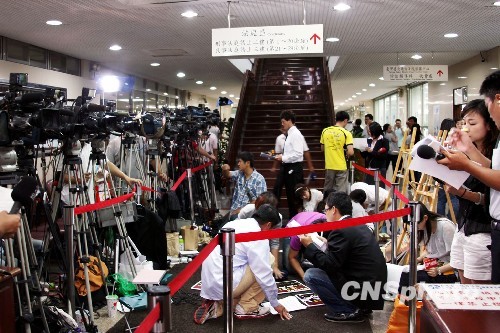 图为大批媒体云集在台北地院内外,连续报道。中新社发 黄少华 摄