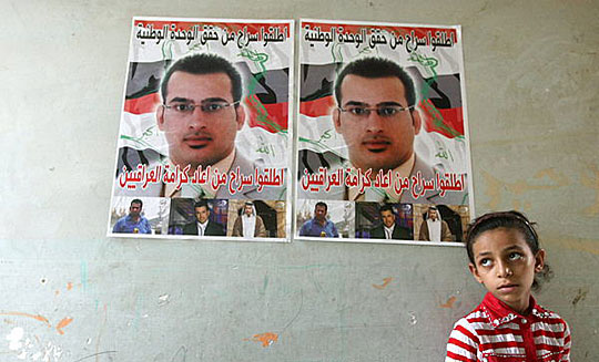 9月10日,伊拉克记者蒙塔兹·扎伊迪的亲人站在巴格达家中张贴的他的画像下。
