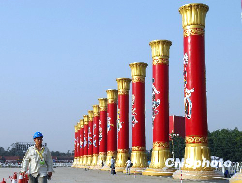 9月14日,一名工人从北京天安门广场东侧竖起的“中华民族团结柱”前走过。从当天起,广场附近将连夜安装56根绘有各民族图案的柱子,代表我国56个民族和谐一家、喜迎国庆。中新社发 侯宇 摄