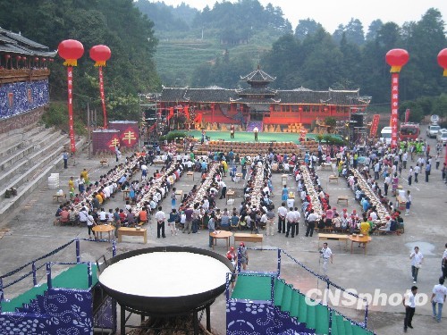 9月14日,万人参与、规模巨大的“天下第一合拢宴”在湖南怀化中国侗文化城等5个宴会场快乐开餐,来自美国、马来西亚、日本、香港等国家和地区近万人共品侗族盛宴。中新社发 肖前辉 摄