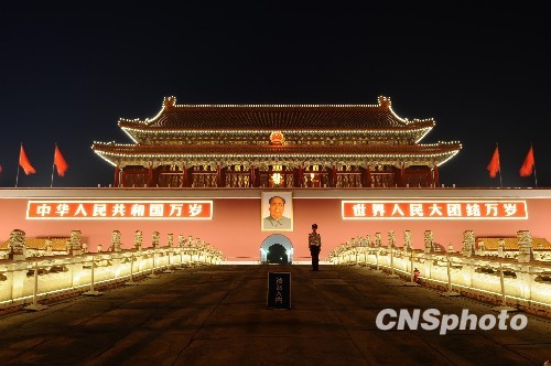 9月14日晚,首都国庆夜景照明设施试亮灯。据了解,为迎接新中国成立60周年,北京市共有14项21个夜景照明设施进行了改造新建。国庆期间,天安门、长安街及其延长线、中轴线等大型建筑、景观都将被夜景照明灯点亮。图为天安门城楼在夜景照明灯的妆点下熠熠生辉。