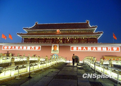 2009年9月14日晚,首都国庆夜景照明设施试亮灯,当晚天安门城楼夜色璀璨,美丽壮观。为迎接国庆60周年,北京市对天安门地区进行照明改造,涉及天安门、纪念碑基座、国旗杆基座、金水桥、观礼台、正阳门等处。天安门城楼在原泛光灯的基础上安装新的照明设施,使天安门城楼亮度更加均匀、红墙色彩还原,避免对城楼产生眩光,改善视觉环境,达到庄重、大方、恢弘、亮丽的效果。经过此次改造后,天安门地区夜景照明能耗节约显著,总功率由原来的210.2kW减少至100kW。中新社发 玉龙 摄