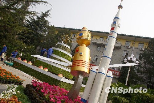 9月17日,工作人员在北京外国语大学门口加紧布置“神州飞天”国庆主题花坛。随着国庆临近,北京各大街小巷纷纷摆上各色各样的主题花坛喜迎祖国60华诞。中新社发 郑雄增 摄