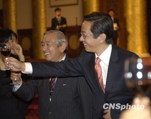图为9月17日,共青团中央书记处书记、全国青联副主席卢雍政(右一)在北京宴请以日中友好会馆代理会长、日本前驻华大使谷野作太郎(右二)为总团长的2009年度第一批日本青少年友好使者代表团一行500人。中新社发 满会乔 摄