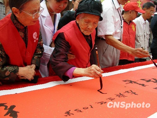 四川百岁老人“孝”字巨幅长卷上挥毫(2)