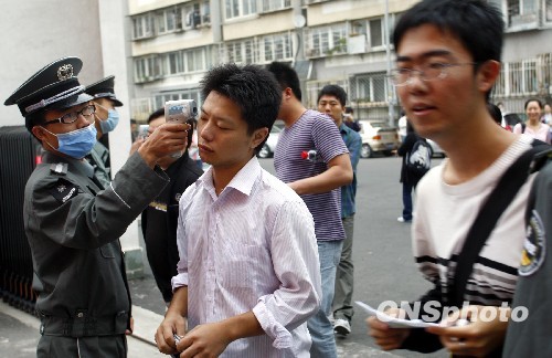 9月19日,为期两天的2009年国家司法考试正式开考。全国报名人数达到41万人,再创历史新高。北京报考人数首次突破3万大关,成为全国最大的独立考区。最新型的手机信号屏蔽器和“作弊克”也同时上岗,避免无线电作弊、替考事件发生。针对甲型H1N1流感疫情防控形势,北京做好考点、考场的消毒工作,每名考生须经电子体温计检测,方可进入考场。中新社发 郑雄增 摄