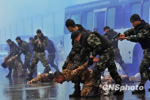 组图:郑州警方雨中举行国庆安保反恐演习(5)