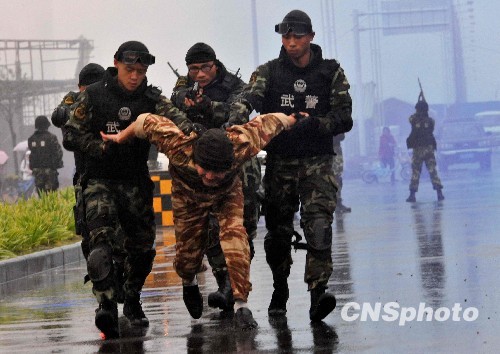 组图:郑州警方雨中举行国庆安保反恐演习(6)