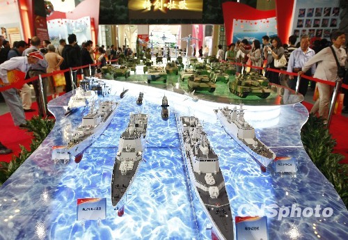 9月20日,“辉煌六十年——中华人民共和国成立60周年成就展”在北京展览馆对公众开放。本次展览分为序展展区、综合展区、专题展区和展望展区四大部分,其中专题展区分为农业、科教、文化、开放型经济等12个单元,展览系统展示了新中国成立60年来特别是改革开放以来中国共产党领导全国各族人民不懈探索中国特色社会主义道路的伟大历程;系统展示了新中国成立60年来特别是改革开放以来经济建设、政治建设、文化建设、社会建设和党的建设取得的巨大成就;展望2020年全面建成小康社会和到本世纪中叶基本实现现代化的美好前景。成就展在展览布局上分为序展、综合展、专题展和展望四个部分。展览将于10月20日结束。图为国防单元展区展出的海陆空三军装备模型吸引参观者。中新社发 盛佳鹏 摄