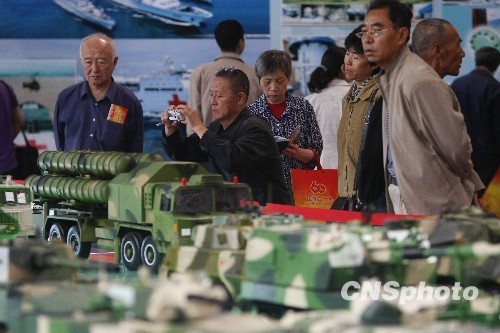 图为国防单元展区展出的海陆空三军装备模型吸引参观者。中新社发 盛佳鹏 摄