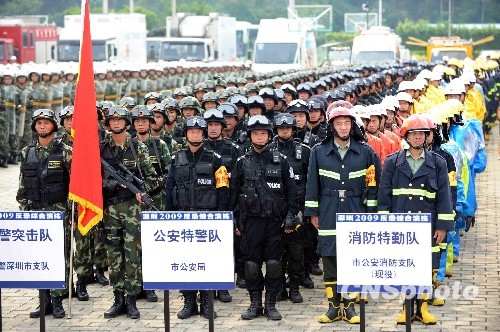 深圳市二00九反恐演练九月二十日在龙岗体育中心举行,来自公安特警防爆、武警反恐、海上突击队、直升机、消防特勤、医疗救护、防化等四千人参加协同反恐演习。