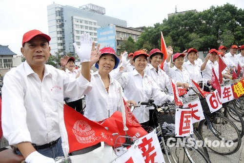 9月22日是“无车日,浙江省台州市椒江老年人自行车旅游者协会的自行车爱好者沿椒江青年路及市区主要街道骑游出行,沿途宣传绿色环保理念,倡导人们“健康环保的步行和自行车交通”。中新社发 王天荣 摄