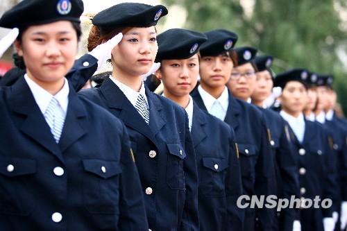 9月22日,北京保全保安公司国庆六十周年安检队的一批“美女保安”正在做上岗前的训练,9月30日她们将奔赴国庆游行群众安检工作现场,并于10月2日之后转场到北京十大国庆游园继续服务。