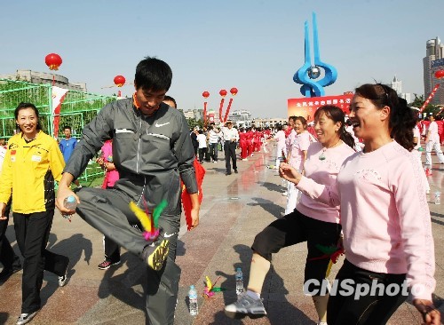 2009年9月22日,全国全民健身志愿服务活动启动仪式在济南泉城广场举行。刘翔、许海峰、罗雪娟、孔令辉等多位奥运冠军担任全民健身志愿者,出席启动仪式,并与群众一起做运动,向市民传授健身方法和各种体育器材的使用方式。中新社发 潘永强 摄