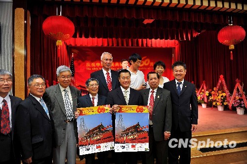 图为华侨华人在新中国成立66周年巨幅海报前合影留念。中新社发 陈钢 摄