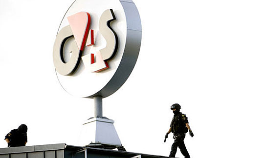 警方在一家被盗窃的保安公司房顶上勘察。