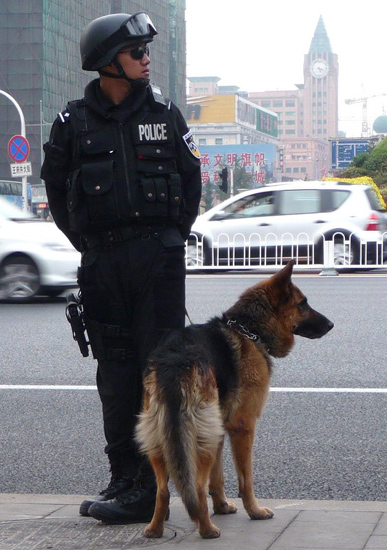 “蓝剑突击队”北京市街头持枪携警犬执勤,以保国庆60周年安全。龚文豹 摄