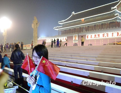 9月25日晚间,一名女游客手持国旗在天安门前留影,随着国庆节的日益临近,中国人民的爱国热情也渐入高潮。中新社发 侯宇 摄
