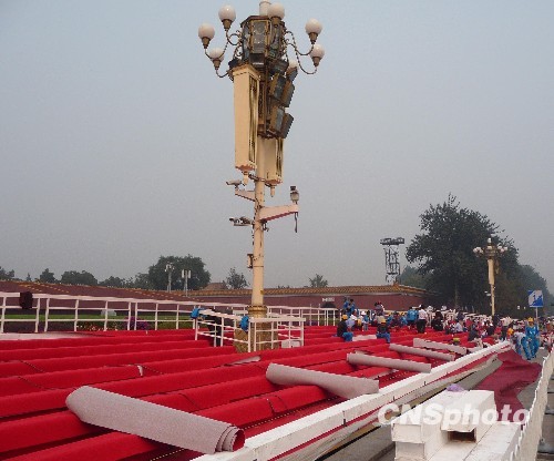 图为工作人员正在为天安门观礼台加装长“凳子”。中新社发 玉龙 摄