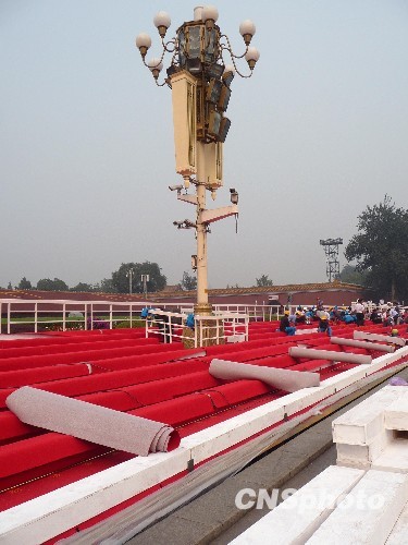 图为工作人员正在为天安门观礼台加装长“凳子”。中新社发 玉龙 摄