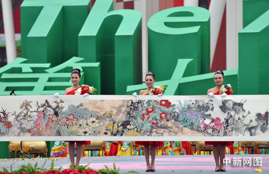 图为开幕式现场礼仪小姐展示32米国画长卷。中新网记者 金硕 摄