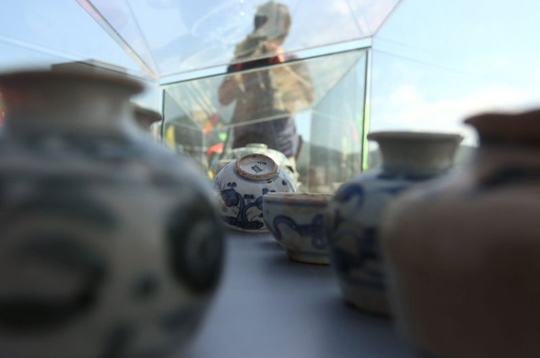 2009年9月26日,汕头市南澳县“南澳I号”水下考古抢救发掘启动仪式现场,一批先期出水的古代瓷陶器吸引了考古专家和媒体的关注。陈伟斌 摄
