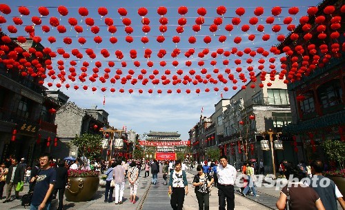 9月28日,北京前门大街全面开市,103家商铺全部开张营业。前门大街的静态布置以红色为主格调,悬挂约1万盏灯笼,房顶66处飘扬五星红旗。