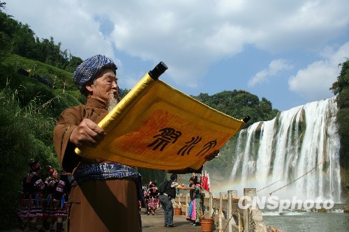 9月28日,贵州黄果树瀑布节“唱山祭水”大典隆重举行。布依族、苗族、仡佬族等多个少数民族身着亮丽的传统服饰,运用民族音乐、器乐、舞蹈、蜡染、地戏等民族元素,开展传统的唱山、祭水活动,以情代声、以舞代言、以歌传神,展现了贵州传统、原生态的古朴祭祀文化。