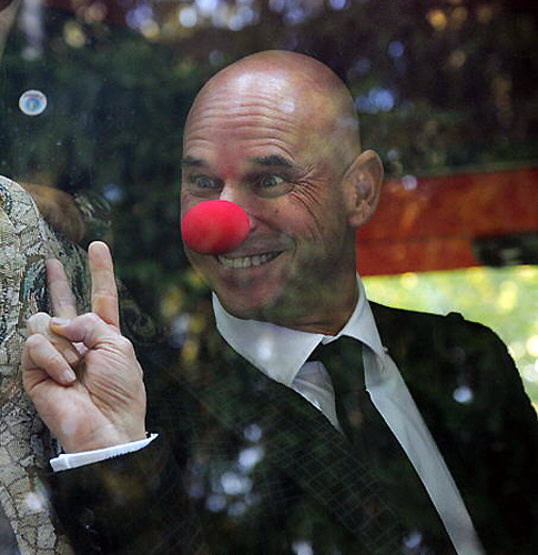 图为前杂技演员拉利伯特戴着小丑鼻子,在哈萨克斯坦拜科努尔发射场与前来看望他的朋友们挥手致意。
