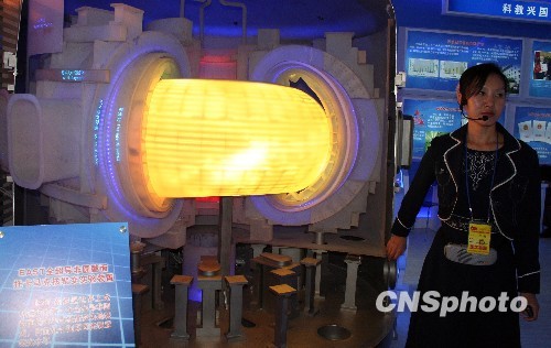 9月29日,“辉煌六十年——中华人民共和国成立六十周年成就展”继续在北京展览馆展出,图为科教单元展区工作人员向观众介绍俗称“人造小太阳”的托卡马克核聚变实验装置模型及其科学原理。中新社发 孙自法 摄