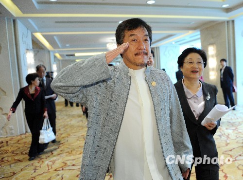 九月三十日,国侨办主任李海峰向各位理事介绍成龙。当日,中国海外交流协会第四届理事大会在北京召开,成龙当选为海外常务理事。被问及赴京参加国庆观礼有何愿望时,他略加思考说:“希望国家未来的日子风调雨顺、国泰民安,现在一直在祈祷‘明天出太阳’。”中新社发 廖攀 摄