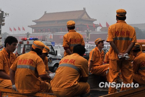 北京天安门广场9月30日进行国庆六十周年庆典的最后准备,抢险队工人随时待命。中新社发 贾国荣 摄