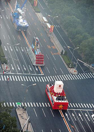 首都各界庆祝中华人民共和国成立60周年大会将于10月1日10时在北京举行。这是参加游行的彩车通过建国门外大街向长安街指定地点集结。