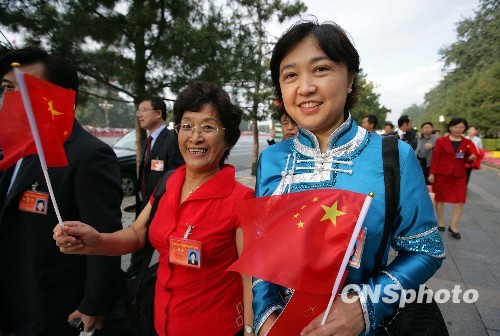 10月1日,中华人民共和国成立60周年庆祝大会开始前,在京参加第五次全国民族团结进步表彰大会的少数民族代表手拿五星红旗步入庆典现场。中新社发 刘震 摄
